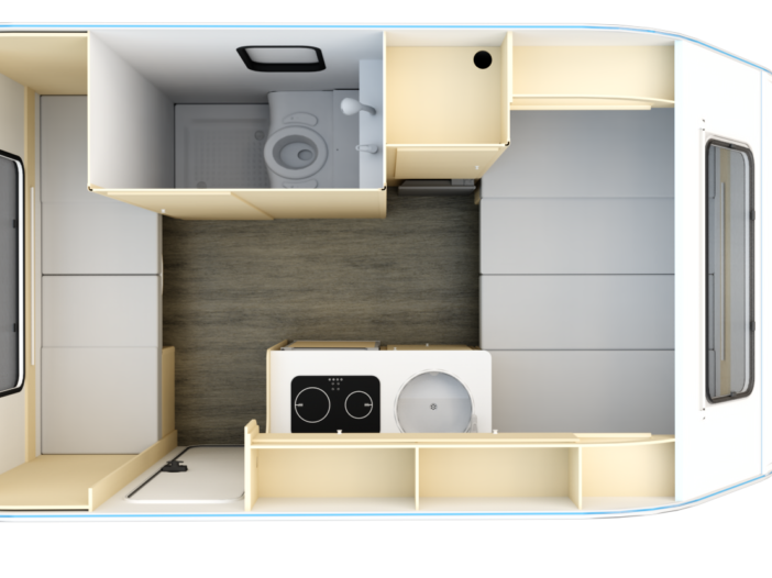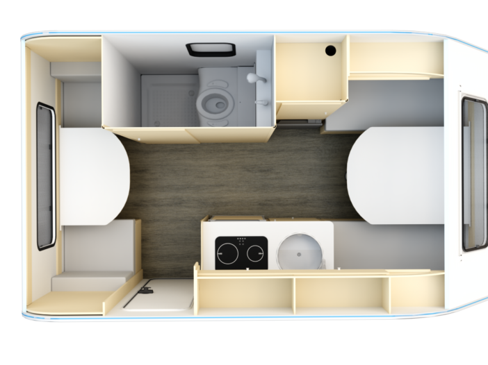La N-Cross 3 es otra de las caravanas más grandes de Bambina, de 3 plazas, construida con paneles sándwich aislantes, cuyo interior puede llegar a acomodar a 3 personas.